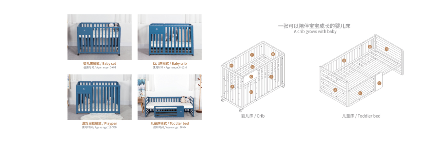 一张可以陪伴宝宝成长的婴儿床,有婴儿床,幼儿床以及游戏围栏模式,并可转变为儿童床